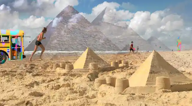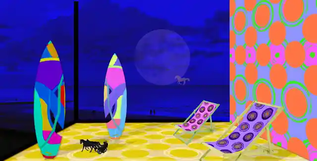 D’un côté, les compositions infographiques, nées de l’expérience du confinement, prennent la forme de « petits théâtres du bonheur » : transats immobiles, plages désertes, murs tapissés de motifs éclatants, soleils trop pleins. Issues d’un temps où le dehors était devenu une scène inaccessible, ces images évoquent un monde lumineux et ludique tenu à distance par des frontières invisibles. La joie y semble prête à surgir sans jamais se réaliser, comme un décor trop parfait, un souvenir trop brillant. Derrière l’éclat affleure l’inquiétude, derrière l’ironie se glisse la mémoire.