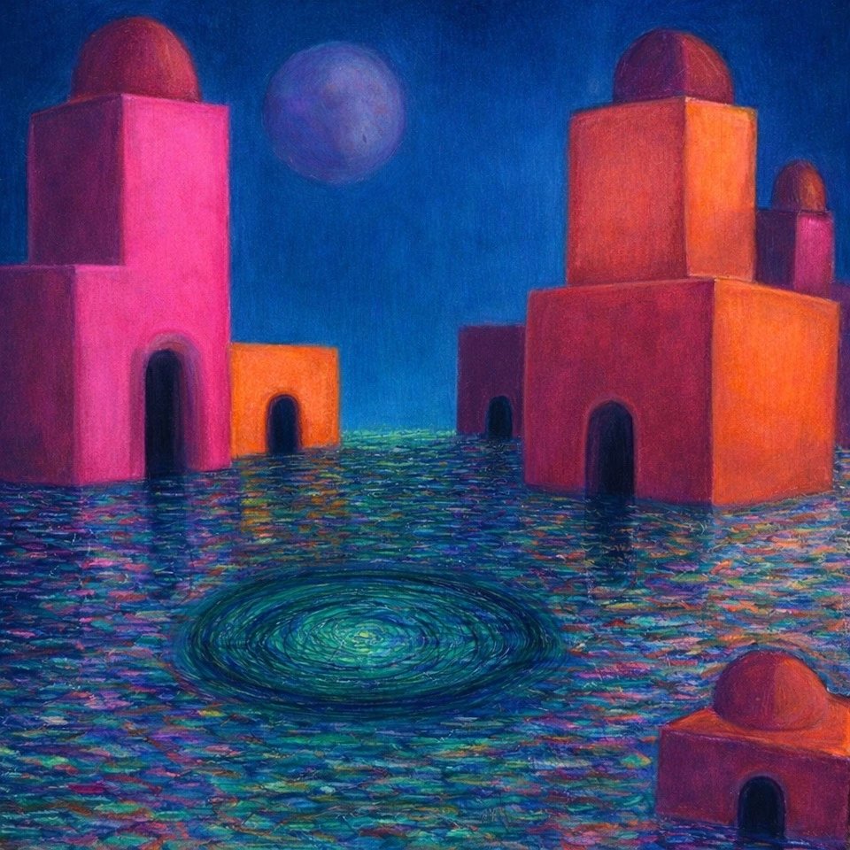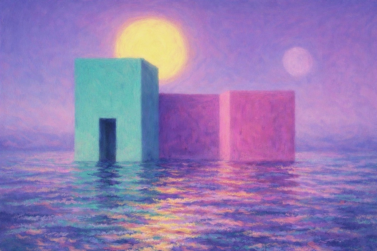 En regard, les pastels gras ouvrent un territoire plus intérieur et plus habité. Architectures flottantes, portes sombres et reflets instables dessinent un paysage en transformation.
