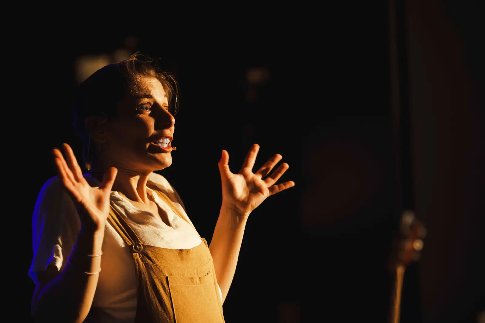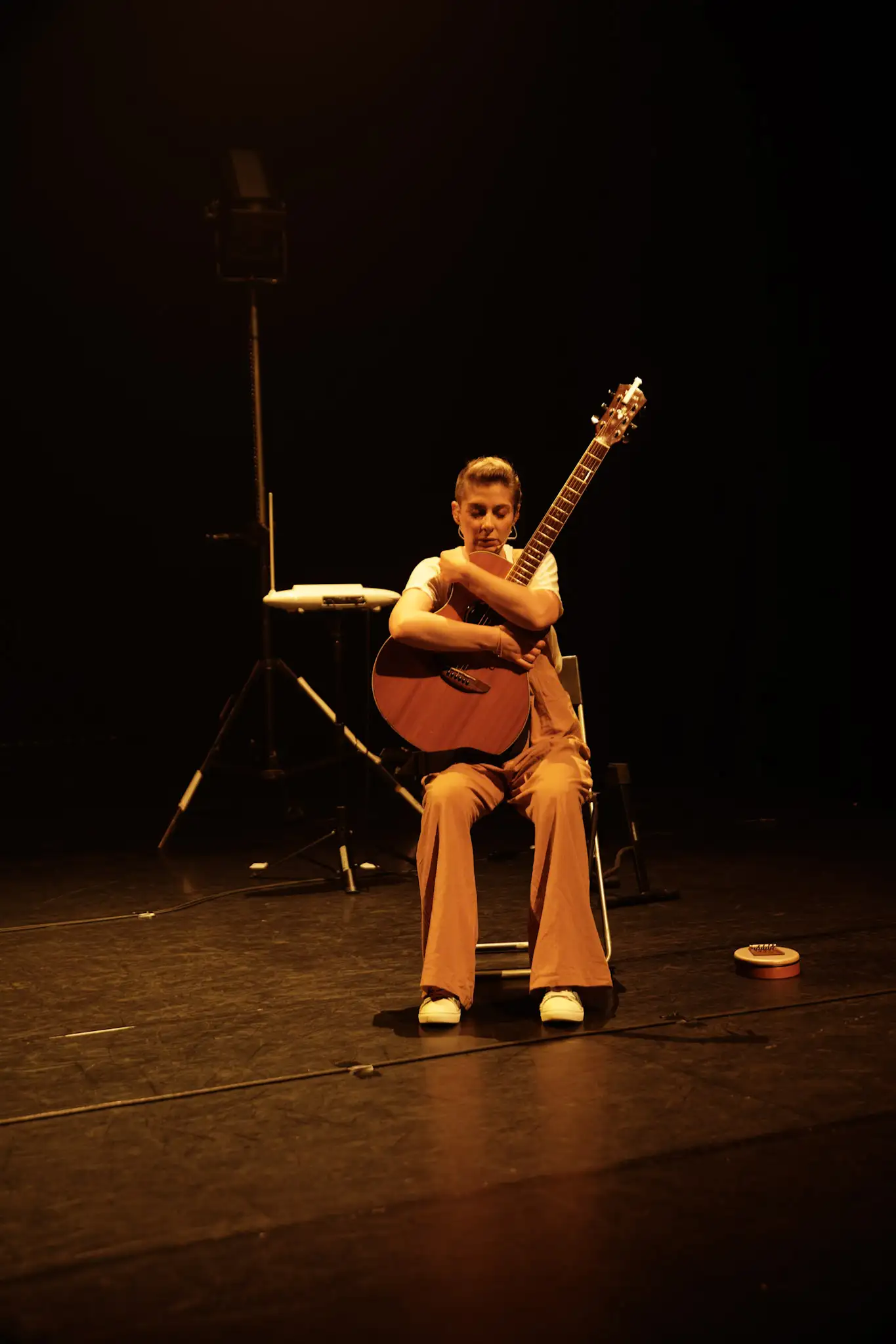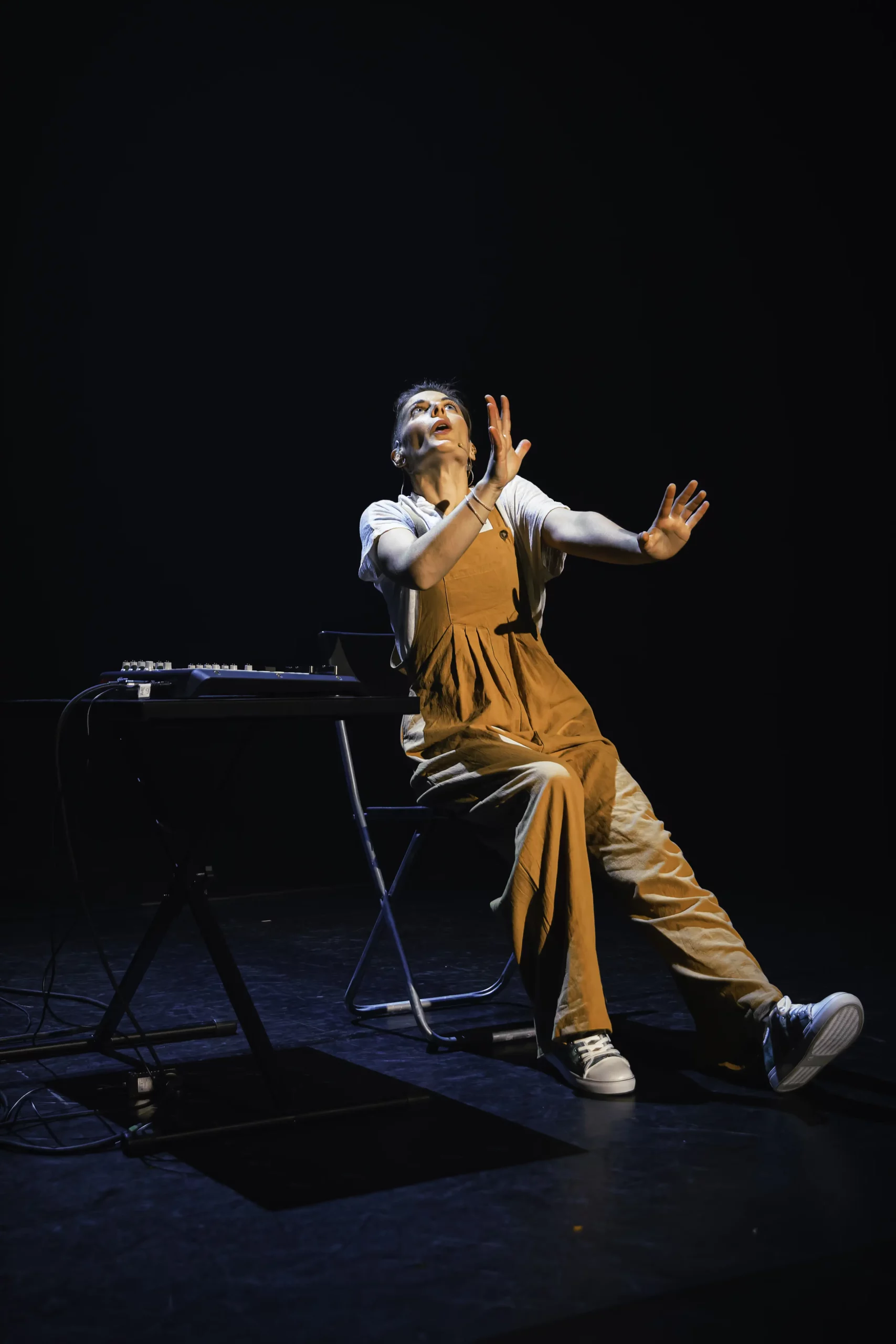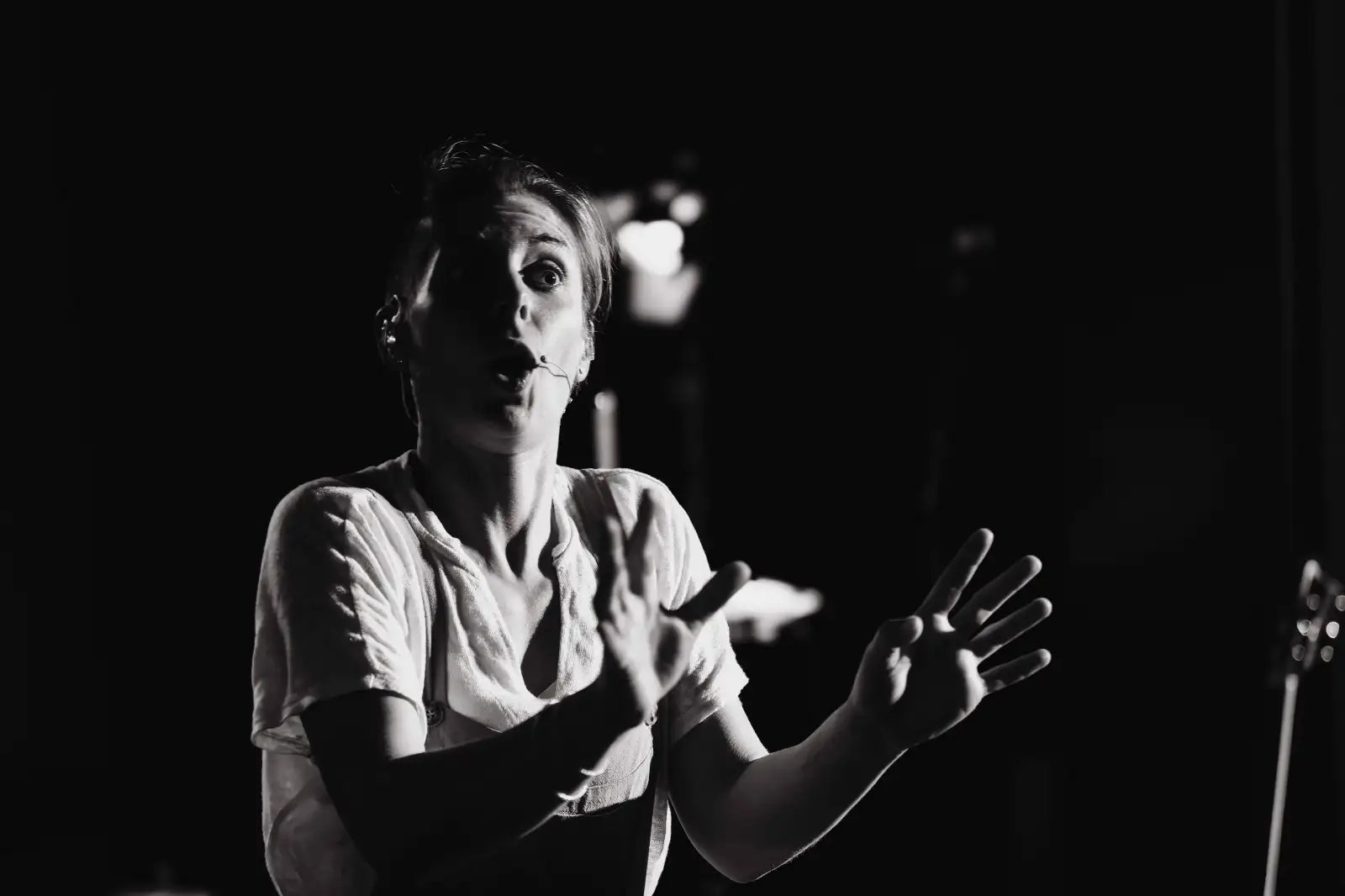 C’est avec un humour poétique et décalé qu’elle nous raconte son parcours pour reprendre la parole. À chaque fois qu’elle trébuche, c’est la musique qui l’aide à se relever, véritable force de vie.